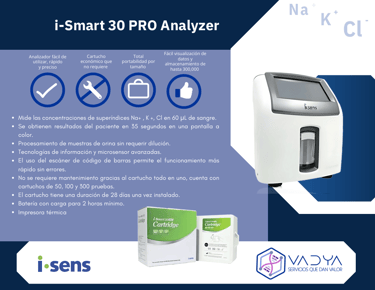El i-Smart 30 PRO es un analizador de electrolitos de última generación, diseñado para la medición cuantitativa de sodio (Na⁺), potasio (K⁺) y cloro (Cl⁻) en sangre completa, suero, plasma y orina.